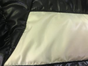 MONCLER ( モンクレール ) ダウンジャケットの染み抜き事例です。濃淡ハッキリと切り替わったデザインのお品で、白い部分に外因による色移りが生じた状態でした。本来撥水性の高いナイロン素材はお洗濯やクリーニングに時に他から色移りが生じる危険性は少ないのですが、それが何らかの要因により一度しっかりと染まってしまうと少々の事では取れない強固なものとなってしまいます。実際の作業においてもやはり色素が中々除去仕切れず、かなりリスクの伴う処理を実施してようやく除去に至った次第です。また、ダウン衣類に関しては他の衣類に比べて作業性の確保が非常に困難な点が挙げられます。基本的にはあまり汚れが蓄積する前に適切なお手入れをして頂きたいと思います。