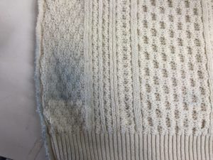 白いセーターに色移りが生じたトラブル事例です。お品の裏側だけに色移りが見られた事から、おそらくは重ね着していたインナー衣類の色落ちによるものかと思われます。かなり広範囲に付着しておりましたが、幸いにも生地に強い定着は見られず、奇麗に除去する事が出来ております。