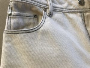 白いデニムのパンツの染み抜き事例です。前面腰回りに青いインクと思われる色素が多量に付着した状態でした。プリンターのインクを交換する際等、何らかのアクシデントによるものかと想像しますが、実際のところは不明です。白と言っても、真っ白と言う訳ではありませんので、染みを除去しようと頑張り過ぎると本来の色調であるクリーム色?が損なわれて除去を実施した個所とで色目の差異が生じますので、意外と難しい作業となります。染みが落ちてもその代償として色調が変わってしまってはいけませんので、そのようにならないよう適切に処理させて頂いた結果、現状を維持した状態で色移りを除去させて頂きました。