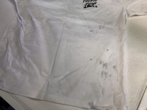 Tシャツをご依頼頂いております。赤ワインが付着したとの事でしたが、適切に対処させて頂き問題なく除去出来ております。染み抜きとは直接関係ありませんが、Tシャツのデザインとしてはあまり見かける事がないリバーシブルのお品でしたので、事例として取り上げさせて頂きました。また、赤ワインの染みは一般的には除去が難しいとしてメディア等で取り上げられる事がありますが、我々プロにとっては確実に除去出来る染みの一つですので、もし誤って付着したとしても、慌てる事無くご相談頂ければと思います。