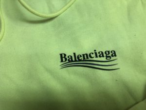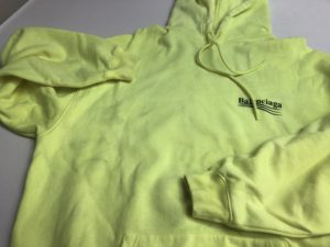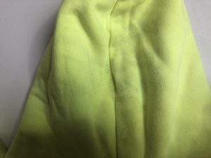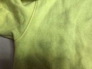 BALENCIAGA(バレンシアガ) フーディスウェットパーカーの染み抜き事例です。ご家庭での洗濯時に発生した他の衣類からの移染トラブルとなります。同ブランドの人気モデル?である蛍光イエローのお品でしたが、移染の除去に有効な処理を実施する事によって蛍光が損なわれて元の色味が変化してしまうリスクを伴う難度の高い状況下での作業となっております。本件のようなケースにおいては色味の変化を抑制するために漂白剤などは用いず、場合によっては蛍光を再加工する等の技術を駆使しながら慎重に作業を進めて行く事になりますが、今回も同様に適切に処理させて頂きました結果、色味を維持した状態で無事移染を除去する事が出来ております。