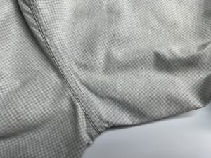 LOUIS VUITTON(ルイヴィトン)シャツの染み抜き事例です。お品の至る所に古く黄ばんだ染みの付着と配色の柄から色滲みしして移染した状態が併発しておりました。表側の配色部分がフロック加工(基布に対し植毛した柄)で構成されている事と、柄に紛れて染みの位置が正確に捉えられない等、作業性確保が困難な状況下、裏側から染み抜きをする事によって上手く処理する事が出来ました。