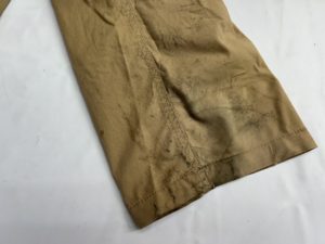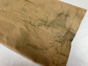 綿パンツの染み抜き事例です。お尻部分全体に付着した黒ずみ汚れに加え、裾部分には自転車のチェーンに巻き込まれた際に付着した機械油が付着している状態でした。既に染みを処理された形跡が有り、強固に汚れが刷り込まれた状態でしたが、弊社にて適切に処理させて頂いた結果、問題なく除去出来ております。