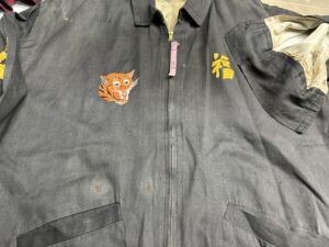 ベトジャンの染み抜き事例です。1960年代のヴィンテージ品となります。ベトジャンはスカジャン同様に当時駐留していた米兵に対する日本の土産物(スーベニア)として企画製造された衣類です。スカジャンの展開時期が1950年代の朝鮮戦争当時なのに対して、ベトジャンはその後に勃発したベトナム戦争時の物となります。今回のご依頼品は染み付着に伴い脱色が併発している状態でご依頼頂きましたが、弊社にて染み抜きと染色による補完作業を実施させて頂きました。尚、今回は裏地の染み抜きはお客様のご予算の都合により実施を見送り、表地のみを対象に施術させて頂きました。