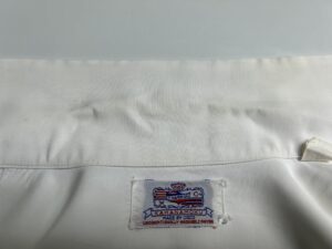 レーヨンアロハシャツの染み抜き事例です。ご依頼品はカナハモクのヴィンテージアロハシャツ(1950年代のお品と推定)となりますが、襟に着用による皮脂汚れと黄ばみの付着に加えて、お品全体が黄ばんで白度が損なわれている状態でご依頼頂きました。全体的に少し収縮が見られる等、年代の古いアロハシャツにありがちな不具合も見られましたので、染み抜きとクリーニングの実施と共に、アイロンによる整形プレスでしっかりと寸法も伸ばさせて頂きました。また、レーヨン素材のアロハシャツは夏季衣類であるにも関わらず、水洗いをすると簡単に縮んでしまう事から、ご家庭で洗濯する事が出来ず、普段のお手入れでお困りの方が多いかと思われます。弊社では、レーヨン素材のシャツ類でも基本的には水洗いを実施して、尚且つ収縮させる事無く処理する事が出来ますので、染み抜きやクリーニングは勿論、汗を含んだシャツ類のお手入れも安心してお任せ頂く事が出来ます。