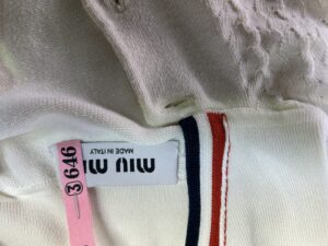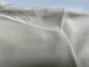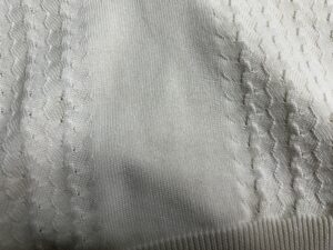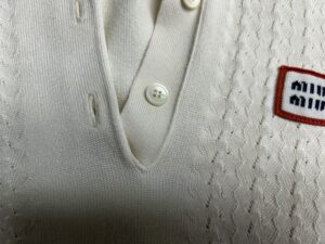 ミュゥミュゥトップスの染み抜き事例です。お客様がご家庭で染み抜きを試みた際に、誤って塩素系漂白剤を使用した事によるトラブルとなります。塩素系漂白剤(キッチンハイター等)は漂白作用が非常に強く、私共プロの染み抜き業者であっても取り扱いが難しく、染み抜きする際にも滅多に使用する事はありません。また、今回のように白い衣類に使用すると、染み抜きを実施した箇所がいわゆる塩素焼けして黄ばんで、新たな染みが生じてしまう結果になりますので、安易な使用は避けて頂きたいと思います。そして塩素焼けして黄ばんだ状態の衣類の染み抜きは極めて困難で、素材によっては除去出来ずに致命傷になる場合もありますので、重ねて注意喚起させて頂きます。そのような状況下、弊社にて染み抜きを実施させて頂きました結果、幸いにも無事除去する事が出来ております。