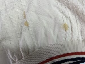 ミュゥミュゥトップスの染み抜き事例です。お客様がご家庭で染み抜きを試みた際に、誤って塩素系漂白剤を使用した事によるトラブルとなります。塩素系漂白剤(キッチンハイター等)は漂白作用が非常に強く、私共プロの染み抜き業者であっても取り扱いが難しく、染み抜きする際にも滅多に使用する事はありません。また、今回のように白い衣類に使用すると、染み抜きを実施した箇所がいわゆる塩素焼けして黄ばんで、新たな染みが生じてしまう結果になりますので、安易な使用は避けて頂きたいと思います。そして塩素焼けして黄ばんだ状態の衣類の染み抜きは極めて困難で、素材によっては除去出来ずに致命傷になる場合もありますので、重ねて注意喚起させて頂きます。そのような状況下、弊社にて染み抜きを実施させて頂きました結果、幸いにも無事除去する事が出来ております。