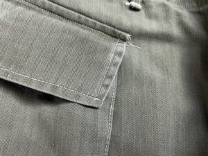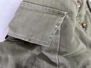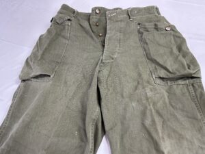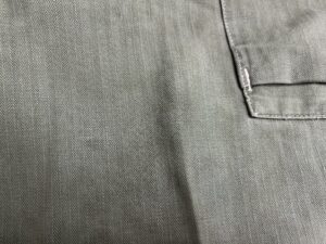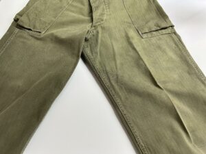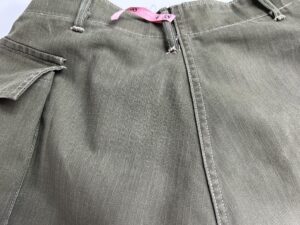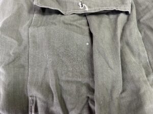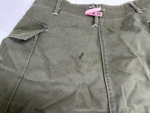 ミリタリーパンツの染み抜き事例です。1940年代米軍M43型となりますが、接着剤に類似する染みが強固且つ広範囲に付着している状態が見られました。カーキ色のヘリンボーンツイル生地で染み除去の代償に色落ちが発生する状況下、除去作業は非常に困難を極めましたが、染み抜き+染色補完の合わせ技で対応させて頂きました。