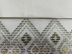 琉球名古屋帯の染み抜き事例です。手先の一部に酸化変色して黄ばんだ染みが付着している状態でした。草木染めされた「花織」と呼ばれる独特の技法によって生産された帯ですが、染み除去に有効な漂白を実施する事によって、いとも簡単に柄部分が脱色する程、染み抜きに対する堅牢性が極めて低い状況下での作業となっております。作業途中に軽度のアクシデントがあったものの(想定内の出来事)染み抜きと染色による補完で対応させて頂き、無事除去する事が出来ております。