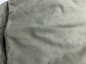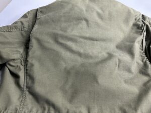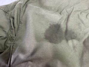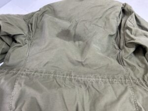 USミリタリーM-65フィールドジャケットの染み抜き事例です。1965年~1966年の1年間だけ製造された最初期型の1stモデルで愛好家の間でもレア度が高いとされている逸品となります。スペックタグなどに破損は見られたものの、損傷も軽度で全体的には美品と思える印象でしたが、唯一残念だったのが背面に大きな油汚れが付着しており、そこだけが強調されて悪目立ちしている状態でした。当初は「ヴィンテージ品はクリーニングに出すと傷むから・・」との思い込みから依頼を躊躇い、染みが付いた状態で着続けるか?迷っていたそうですが、幸い染みの付着も軽度であった事から、納得の結果に大変ご満足して頂く事が出来ました。