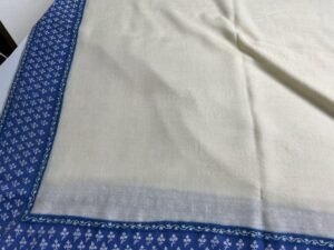 カシミヤストールの染み抜き事例です。お客様がお品を洗ったところ、縁取りの青い濃色部分から色が滲んで中央の白い箇所全体が移染した状態でご依頼頂いました。上質のカシミヤを使用した超が付く程の大判ストールで、部分的な染み抜きではとても対応し切れ無い状況下、お品全体を弊社独自の洗浄方法で処理させて頂きました。除去作業は最悪の場合、致命傷に至るハイリスクな内容を含む方法でしたが、実施の結果、濃色部分が色褪せた以外は、質感、風合いを維持したままで使用可能な状態に仕上がっております。