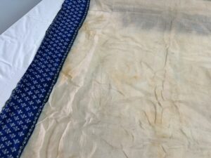 カシミヤストールの染み抜き事例です。お客様がお品を洗ったところ、縁取りの青い濃色部分から色が滲んで中央の白い箇所全体が移染した状態でご依頼頂いました。上質のカシミヤを使用した超が付く程の大判ストールで、部分的な染み抜きではとても対応し切れ無い状況下、お品全体を弊社独自の洗浄方法で処理させて頂きました。除去作業は最悪の場合、致命傷に至るハイリスクな内容を含む方法でしたが、実施の結果、濃色部分が色褪せた以外は、質感、風合いを維持したままで使用可能な状態に仕上がっております。