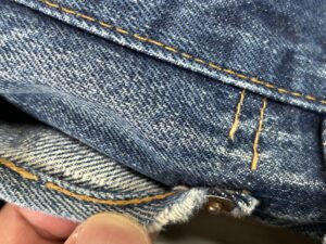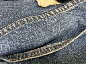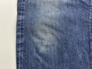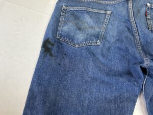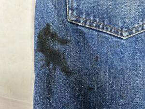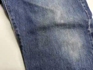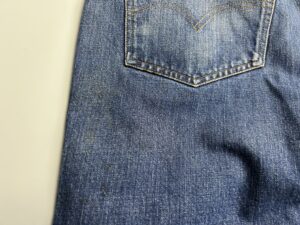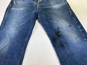 ヴィンテージジーンズの染み抜き事例です。70‘S リーバイス501BIG E 後期型モデルになります。エンジンオイルの廃油に類似する染みがお品の各所に付着している状態で、せっかくのヴィンテージジーンズも穿くのを躊躇われる状態でした。お客様のご要望は染み抜きやクリーニングの実施による「色落ちは避けたい」との事でしたが、我々プロにとっても染みの除去と色味の維持の両立は難しく、今後も目指すべき永遠の研究課題となっています。本件についても、強固に付着しているオイル染みの完全除去を目指す事によって、その代償に実施箇所が色落ちするリスクが増す事から、今回は敢えて染みの完全除去は目指さずに、色落ちや脱色が生じない範囲で処理させて頂きました。その結果、凝視すると薄く染みは残ったものの、十分に着用可能なレベルにまで改善させて頂きました。