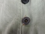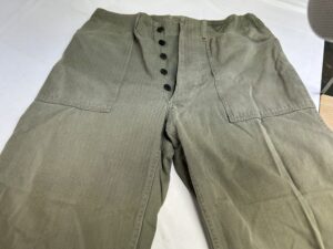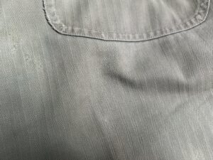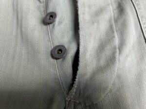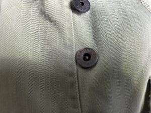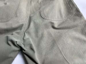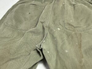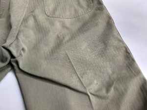 ヴィンテージミリタリーパンツの染み抜き事例です。第二次大戦中アメリカ海兵隊で採用された40‘S「P-41型」ヘリンボーンツイル生地のトラウザーズパンツです。同モデルの最初期型と見られるお品で、当時の主要ディテールであるドーナッツ型メタルボタンの錆が本体に移転して褐色に変色した染みと、接着剤と見られる染みが付着している状態でした。接着剤を除去してみたところ、全ての実施箇所で傷が表面化した事から、それらの補修を試みるために過去の所有者が接着剤を使用したと思われます。表面化した傷の補修については納品後にリフォームして頂く事になるかと思いますが、弊社の守備範囲である錆び染みと接着剤については無事、除去させて頂きました。