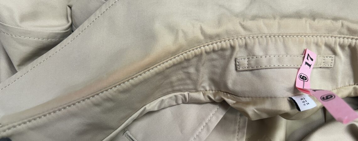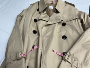 ファンデーションの染み抜き事例です。ご依頼品はバーバリートレンチコートです。厚地の生地の襟に対し、着用時の摩擦によって刷り込まれた状態で染みが頑固に定着している状態でした。付着直後のファンデーションの染みは、比較的安易に除去出来る場合が多いのですが、繰り返しの着用によって汗や皮脂の成分と共に繊維の奥に入り込んでしまう事により、最悪の場合は完全除去が出来なくなってしまいますので、重症化する前に適切なお手入れをして頂くようご注意願います。また、この事例についてはファンデーションの付着だけに止まらず、脱色の併発も見られましたので、施術の内容として、まず染み抜きによってファンデーションを取り除き、除去後に表面化した脱色については染色補正によって、均等な色味になるように処理させて頂きました。せんたく屋太郎では、このように頑固に付着したファンデーションの染み抜きにも対応出来る高い技術がありますので安心してお任せください