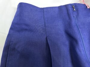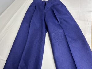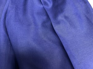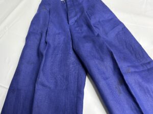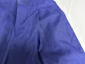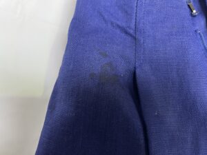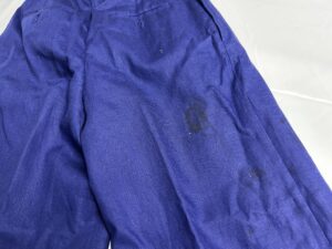 油汚れの染み抜き事例です。原色に近い(画面越しではネイビーブルーに見えますが実際には紫に近い色)色鮮やかな麻素材のパンツに対し、機械油のような染みの塊がべっとりと広範囲に付着している状態でした。「油汚れ=ドライクリーニングで取れる」と、思われがちですが、実際にはそれ程万能と言う訳では無く、油の種類や付着状況によっては洗っただけでは簡単に取れない事も多いです。特に今回の事例のように生地の裏側まで貫通する形でしっかりと定着している場合は、地道に1か所づつ手作業で染みを除去して行く事になります。また、濃い色の場合は染みの除去に有効な処理の実施によって、色落ちや生地擦れが生じやすく、不具合が発ししないように慎重な対応が求められます。そのような、意外に難易度の高い事例ではありましたが、生地を労わりながら処理した結果、ほぼ完全に除去する事が出来ております。