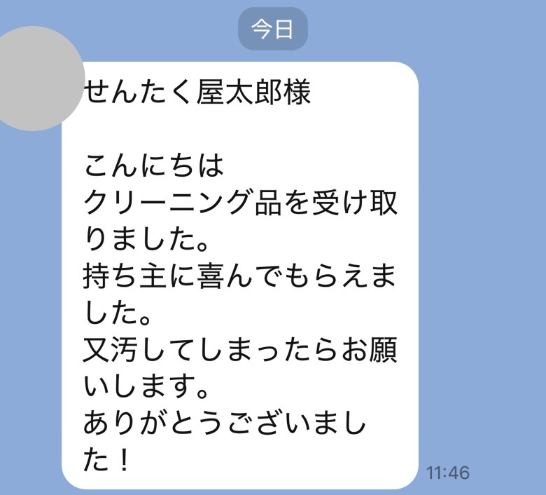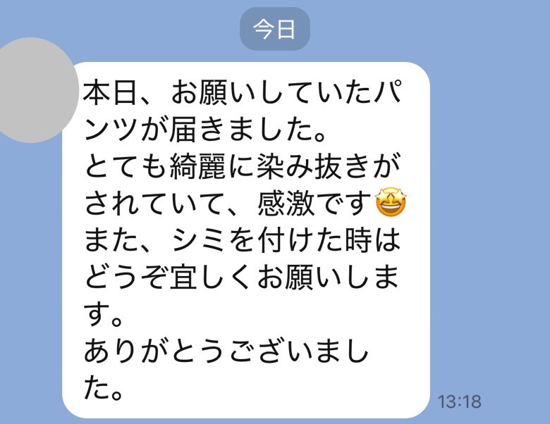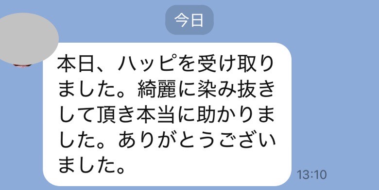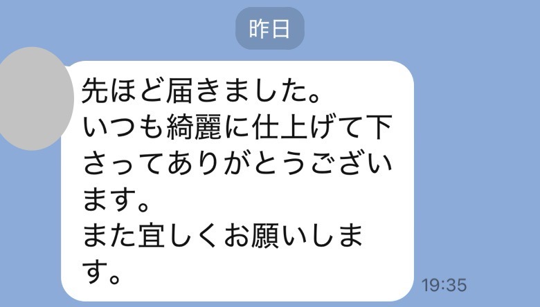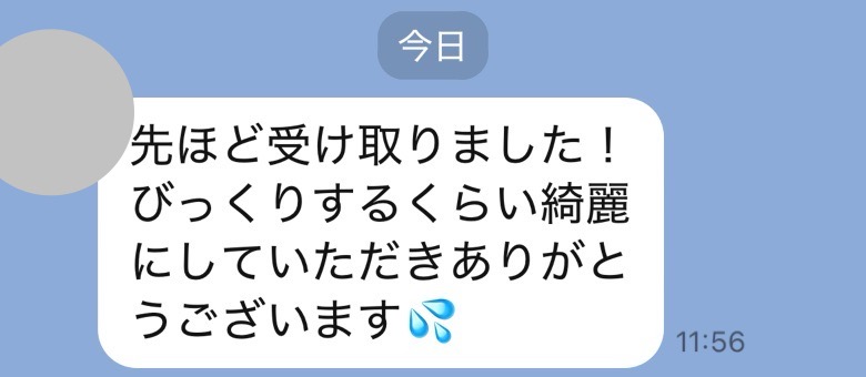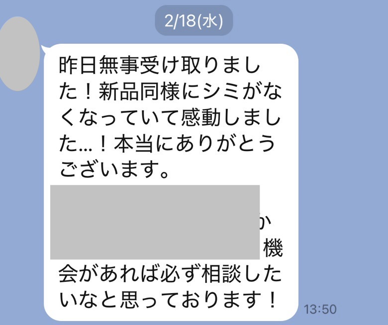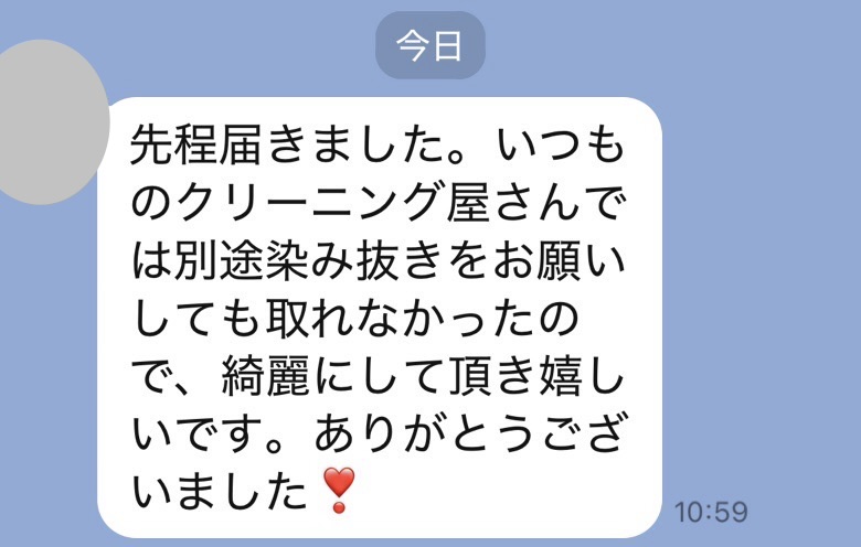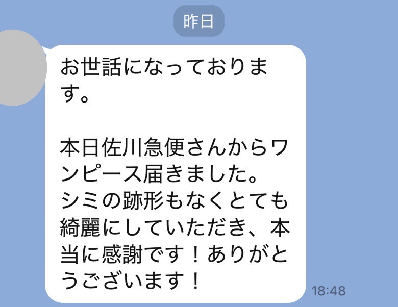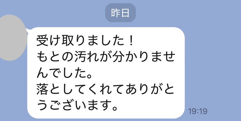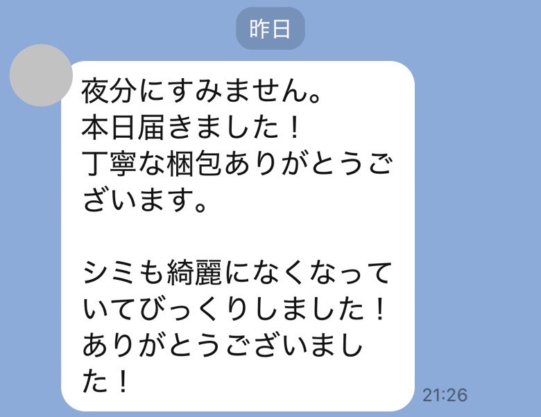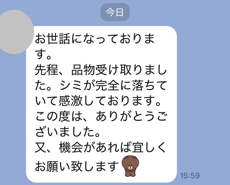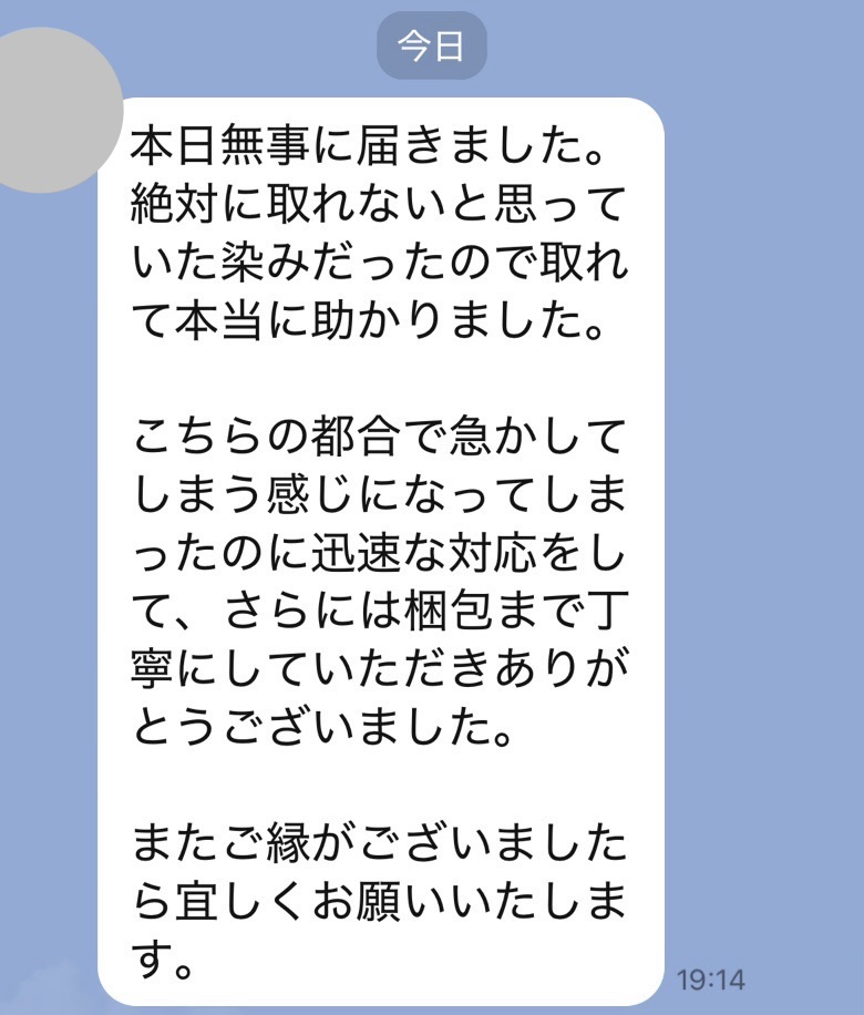 お世話になっております。先程、品物受け取りました。シミが完全に落ちていて感激しております。