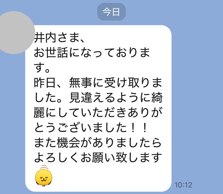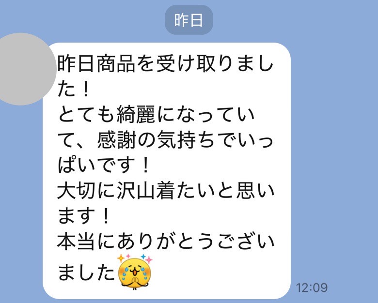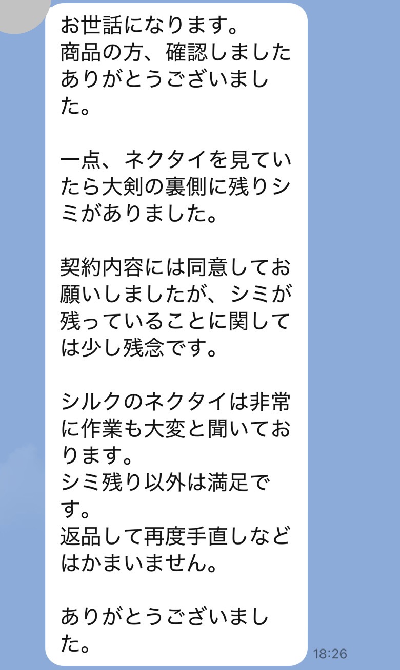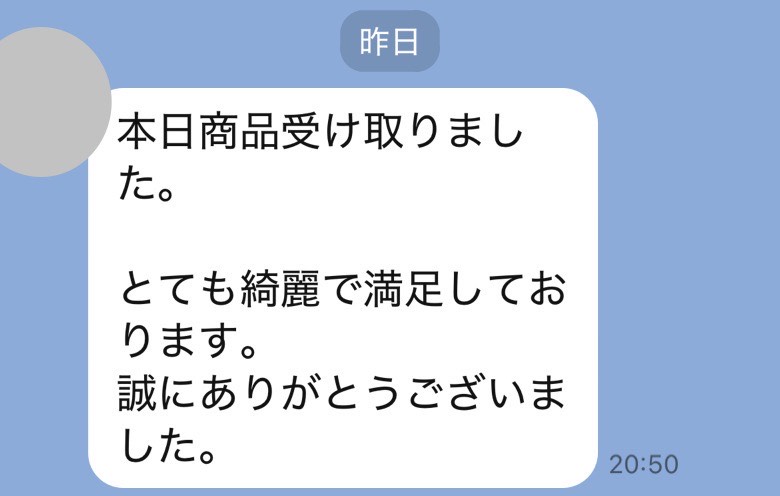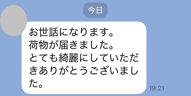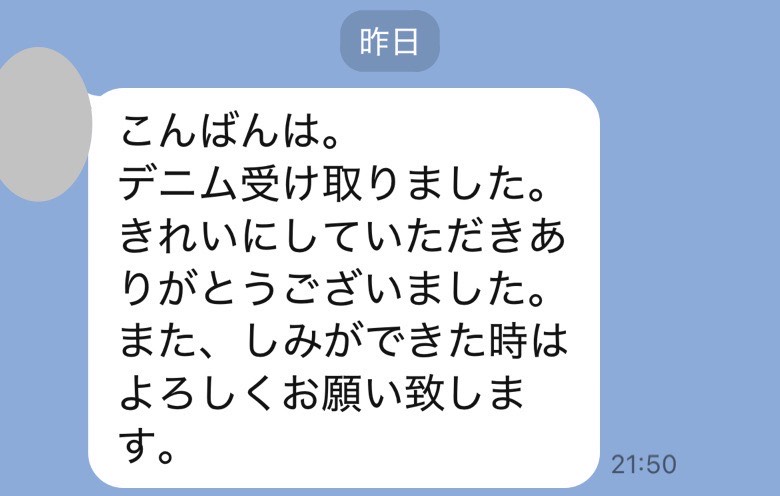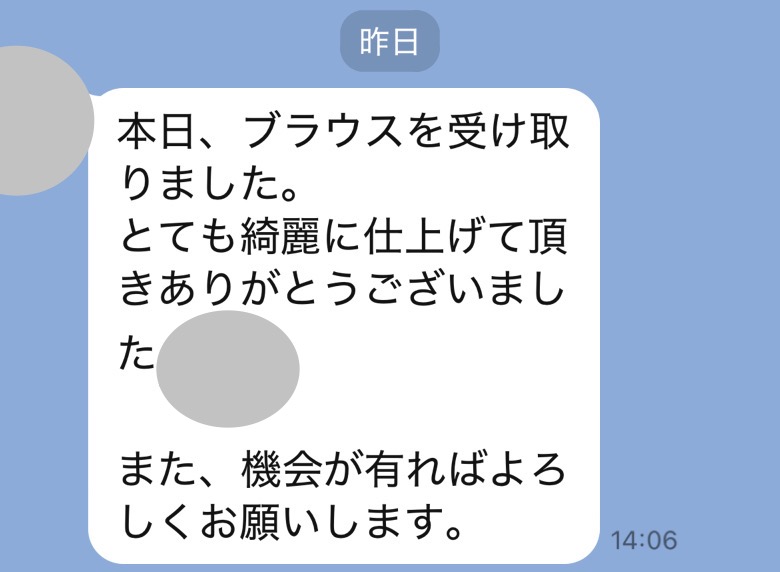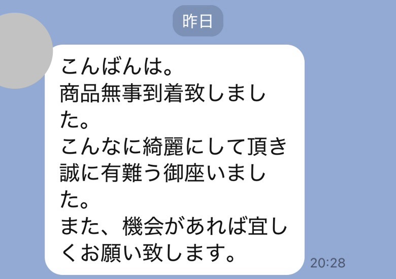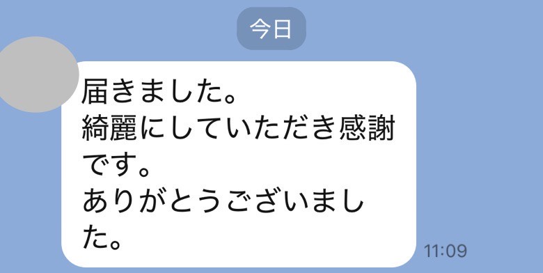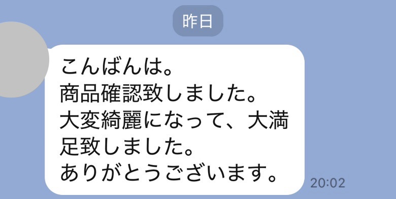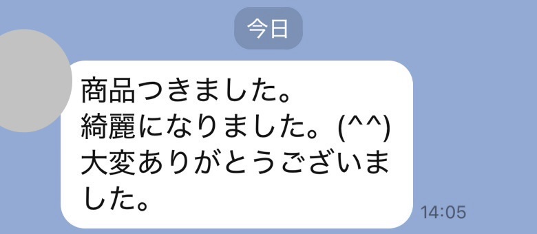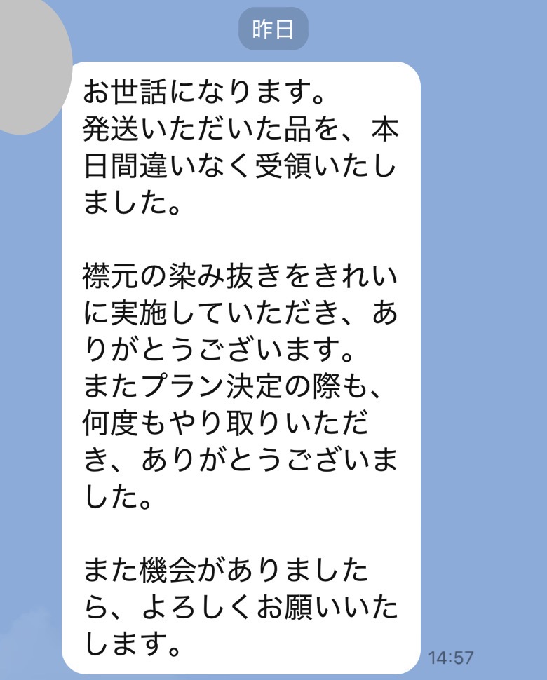 お世話になっております。先程、品物受け取りました。シミが完全に落ちていて感激しております。