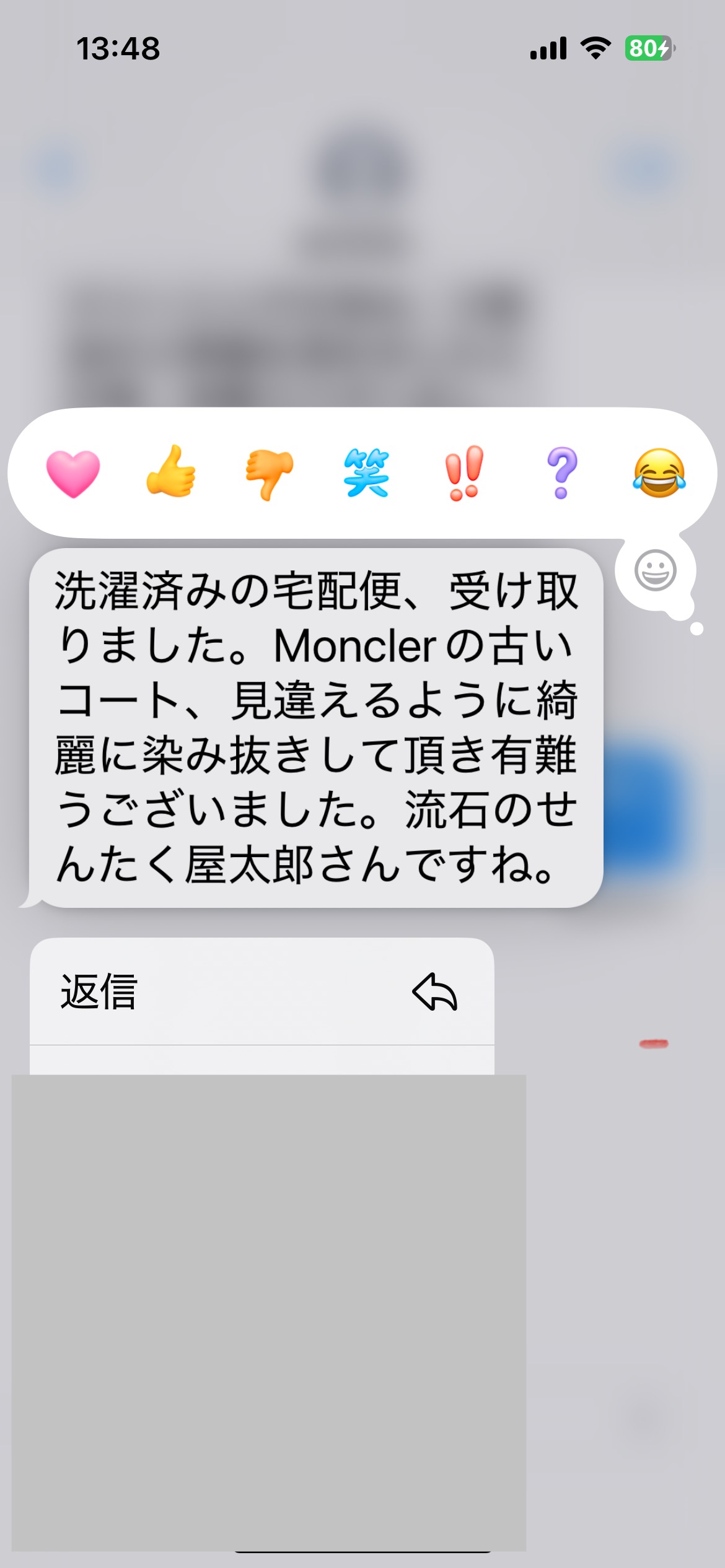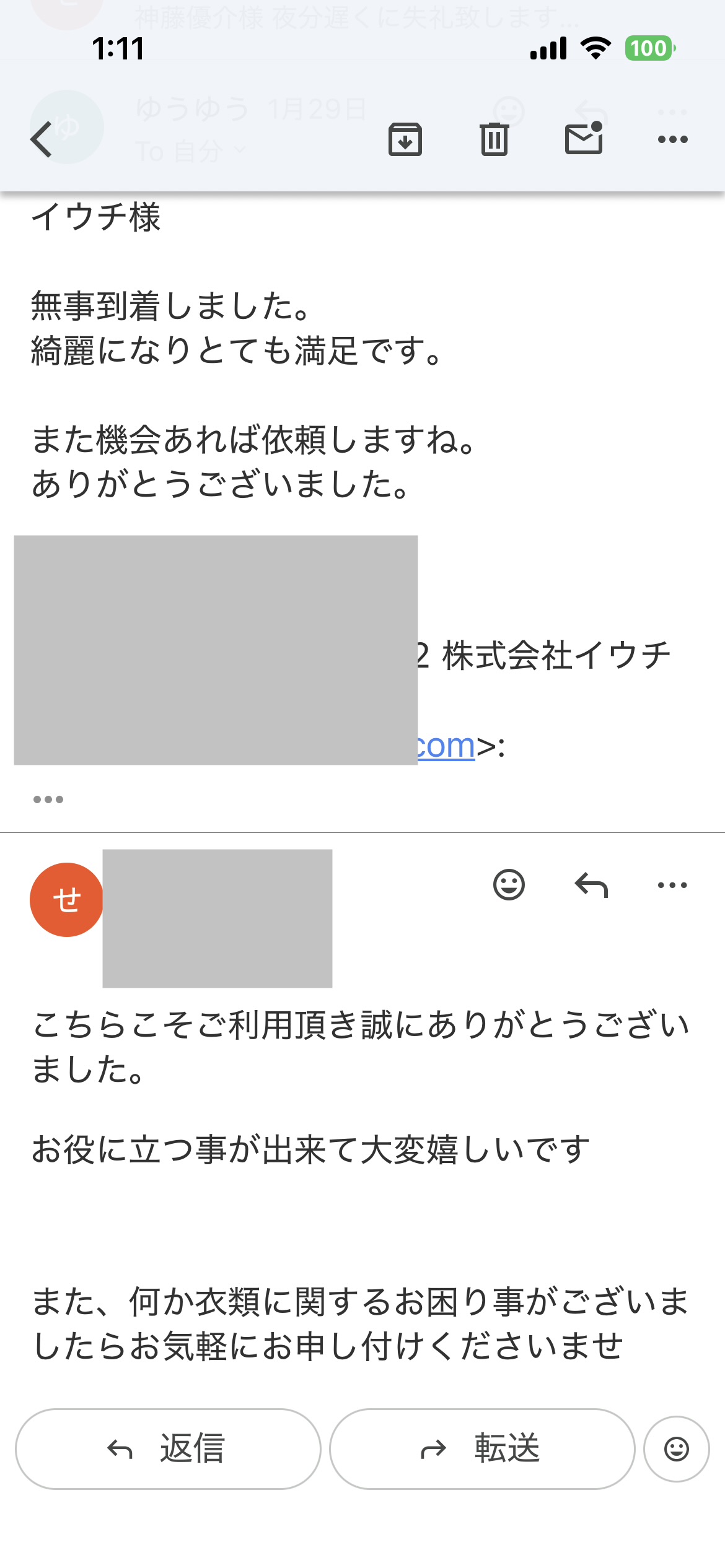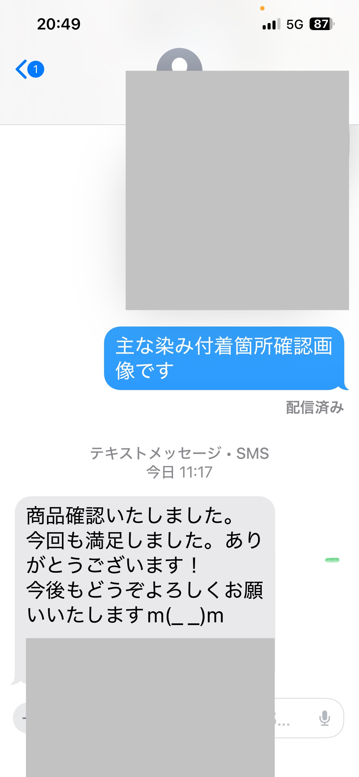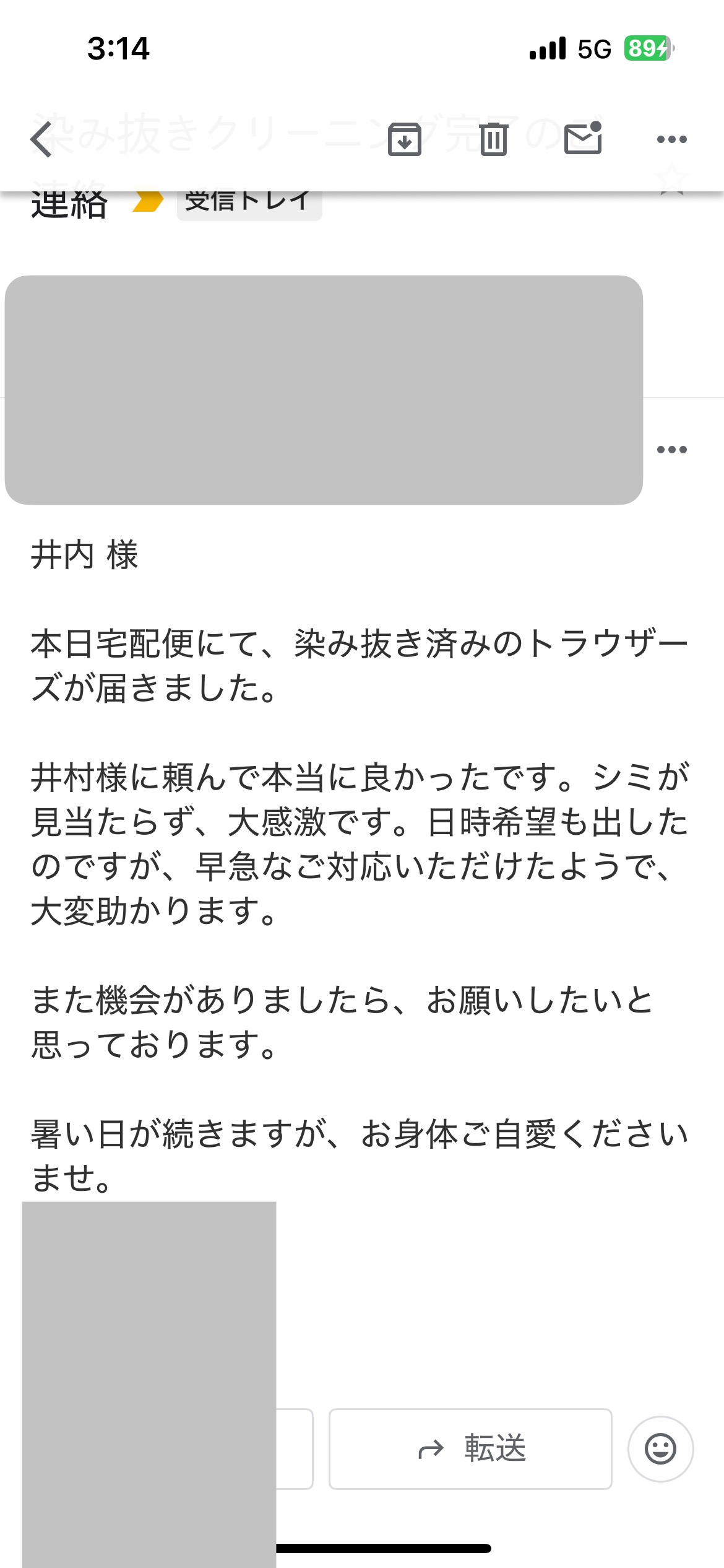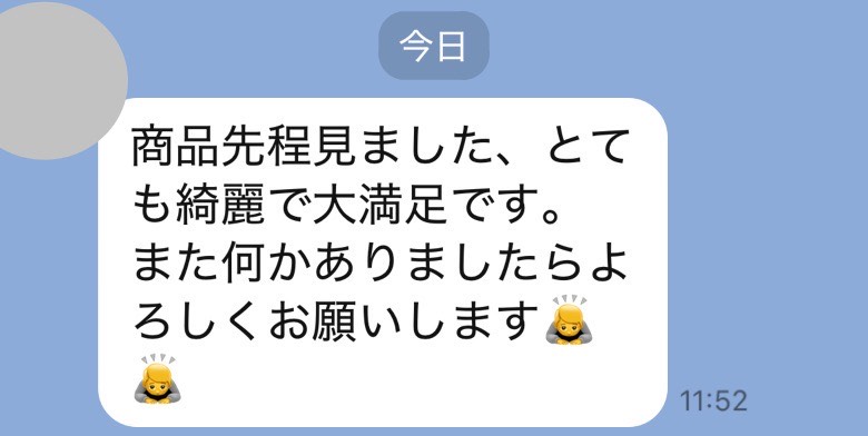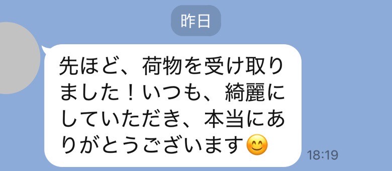 お世話になっております。先程、品物受け取りました。シミが完全に落ちていて感激しております。