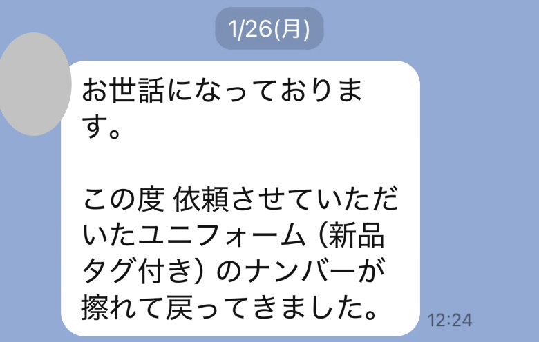 お世話になっております。この度 依頼させていただいたユニフォーム(新品タグ付き)のナンバーが擦れて戻ってきました。