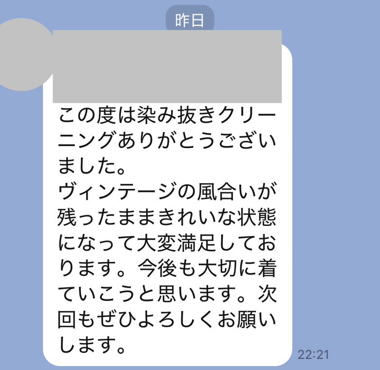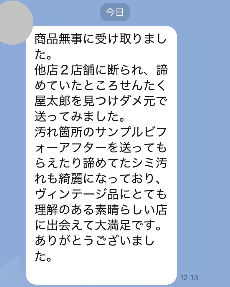 ヴィンテージの風合いが残ったままきれいな状態になって大変満足しております。今後も大切に着ていこうと思います。次回もぜひよろしくお願いします。