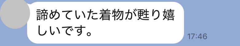染み抜き依頼の件 イウチ様 染み抜き依頼しました着物が届き、確認させていただきました。綺麗にシミが取れており、とても嬉しく思っております。早急に対応してくださり、今年の七五三に着用出来るのでとても助かりました。ありがとうごさいました。 遅ればせながらのメールですみません。