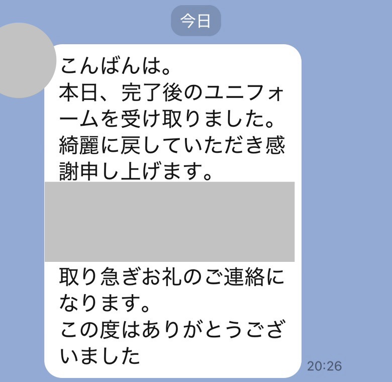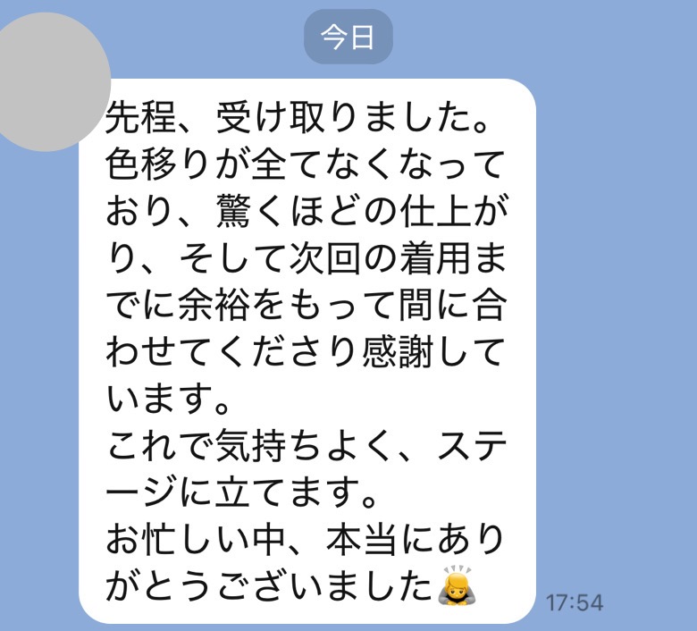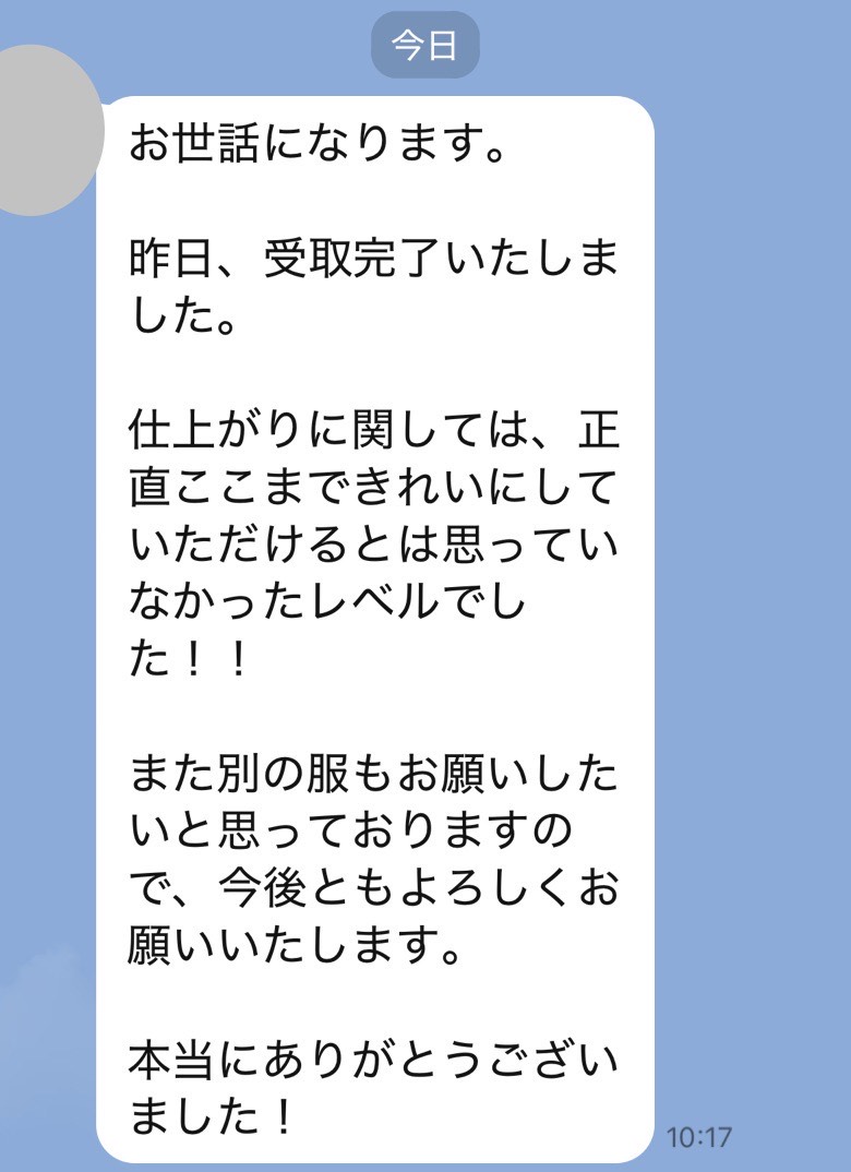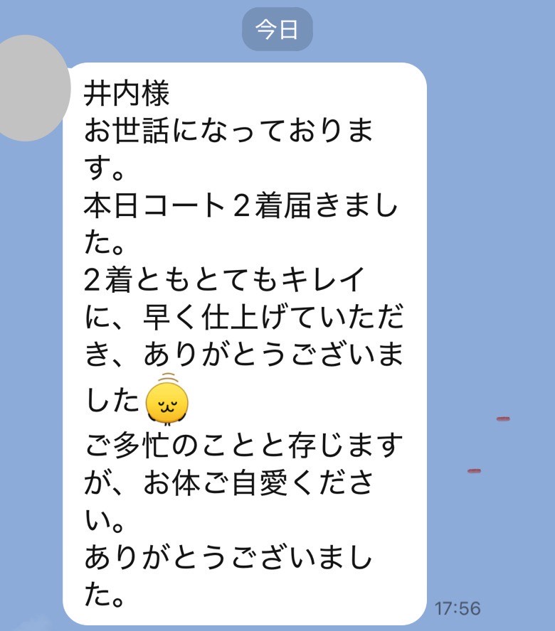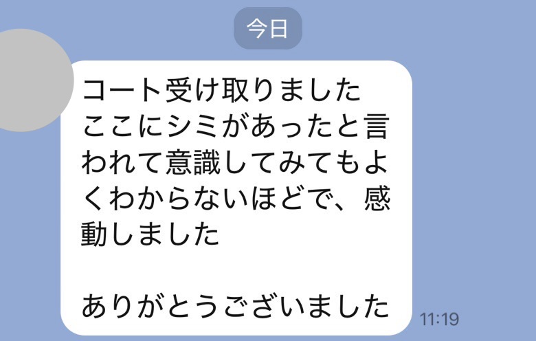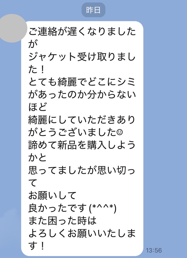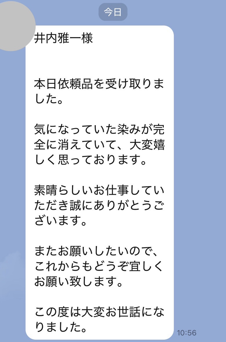 井内様、先程制服受け取りました。どこにシミがあったのか全くわからず、本当に驚いています!