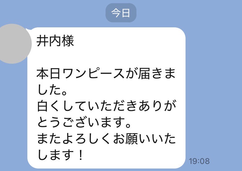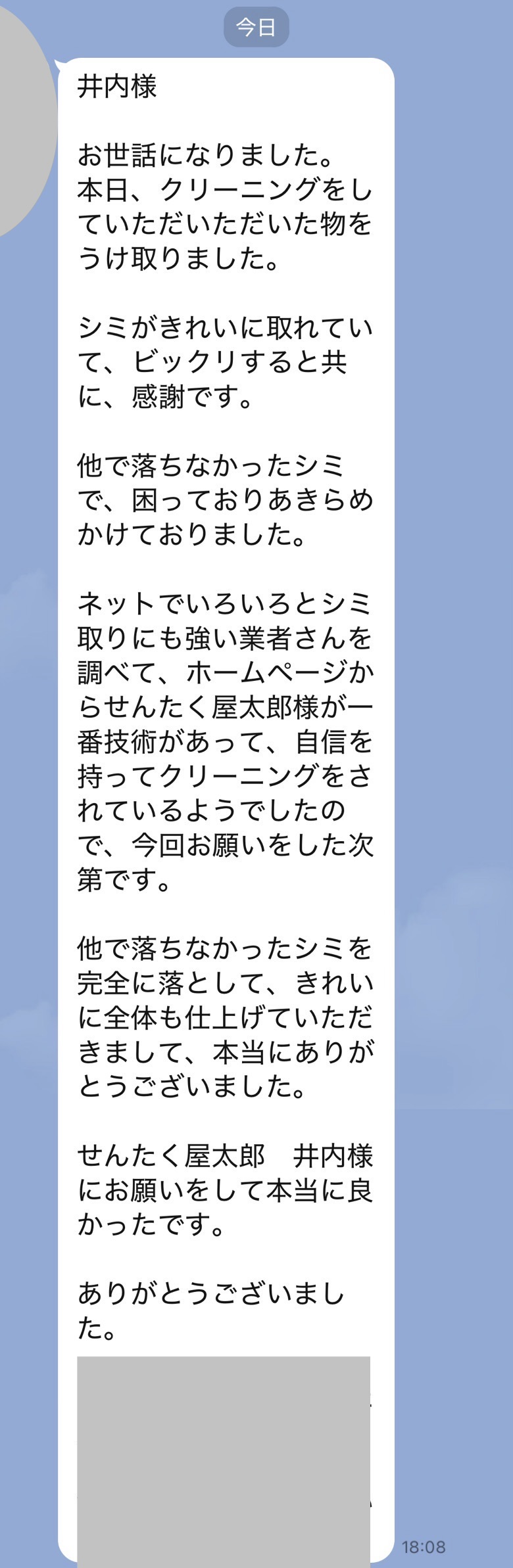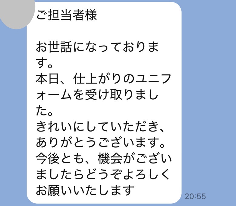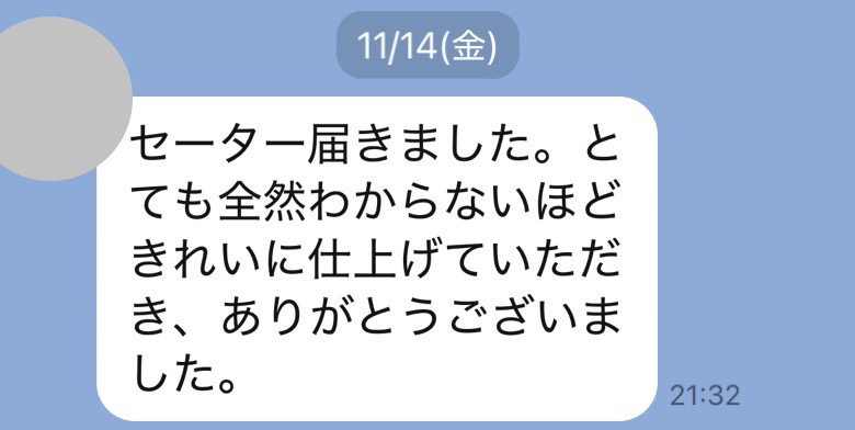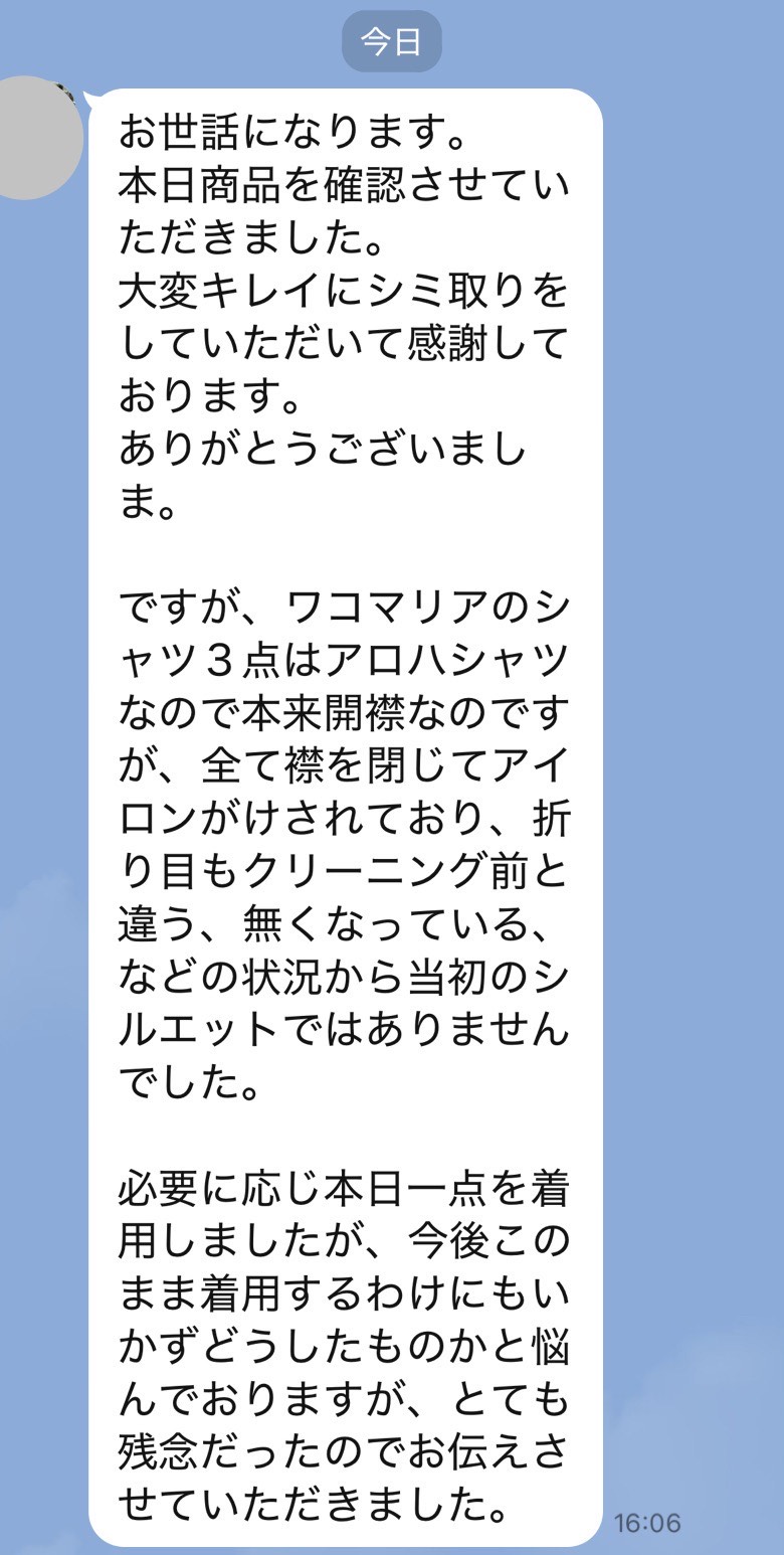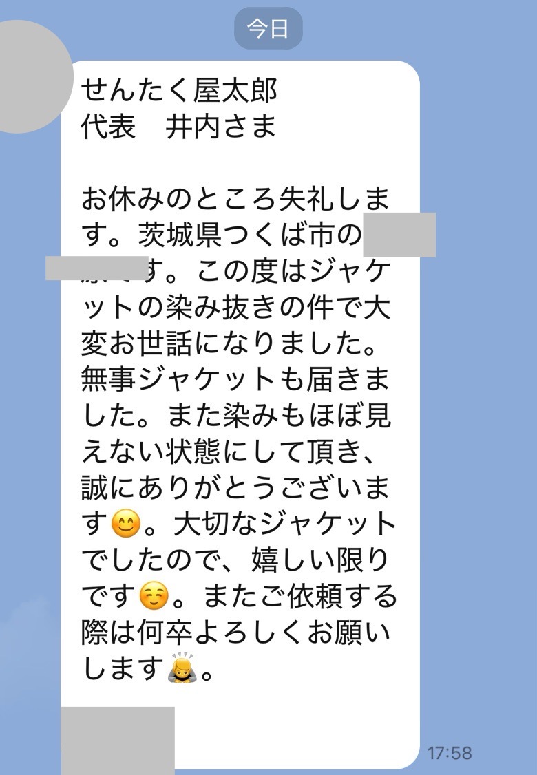 井内様、先程制服受け取りました。どこにシミがあったのか全くわからず、本当に驚いています!