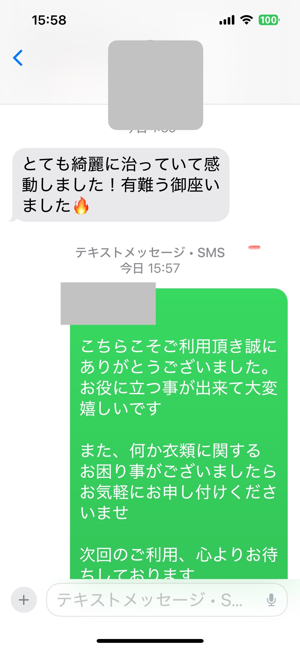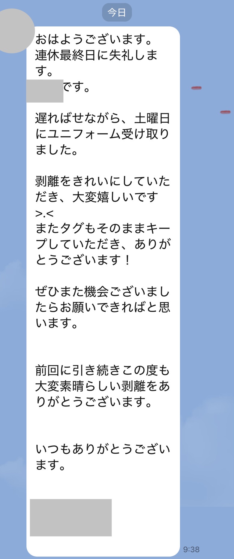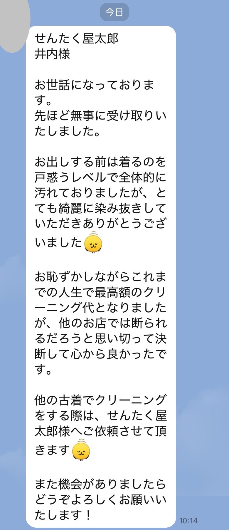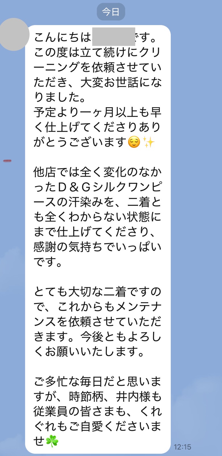 井内様、先程制服受け取りました。どこにシミがあったのか全くわからず、本当に驚いています!