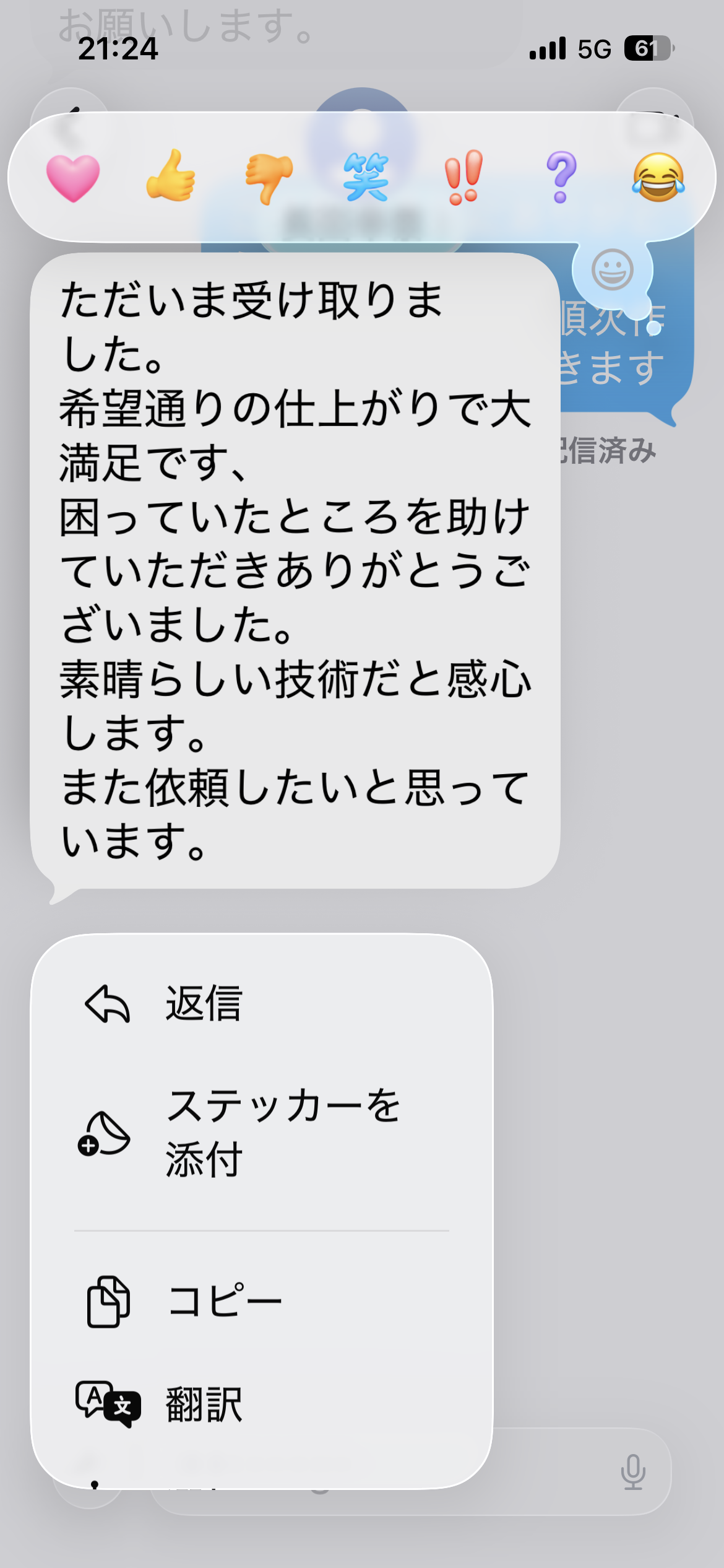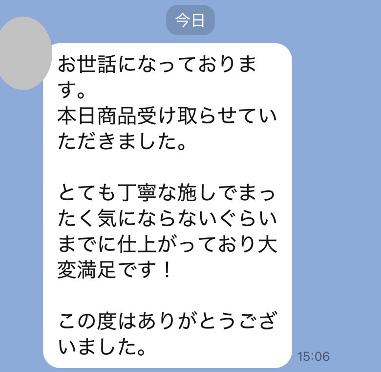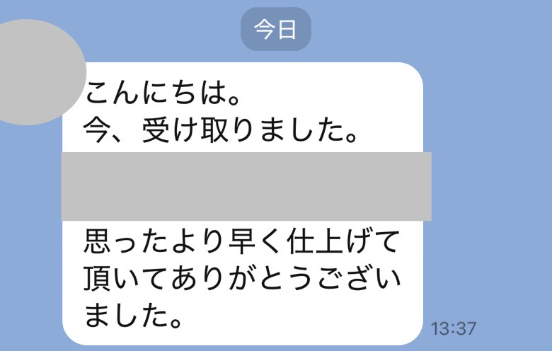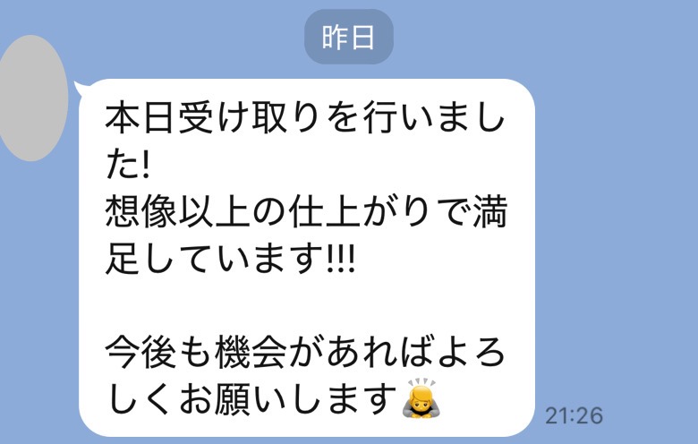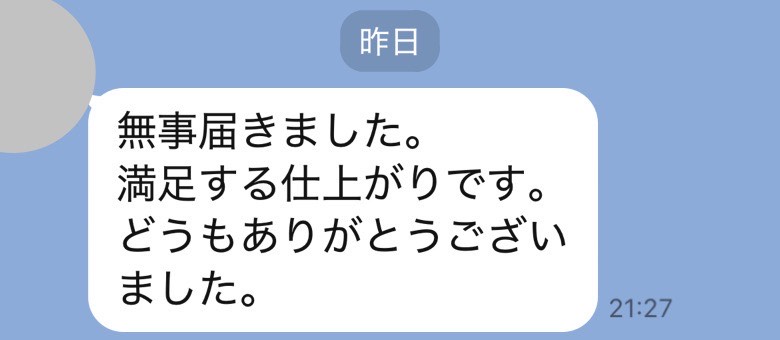 ただいま受け取りました。希望通りの仕上がりで大満足です、