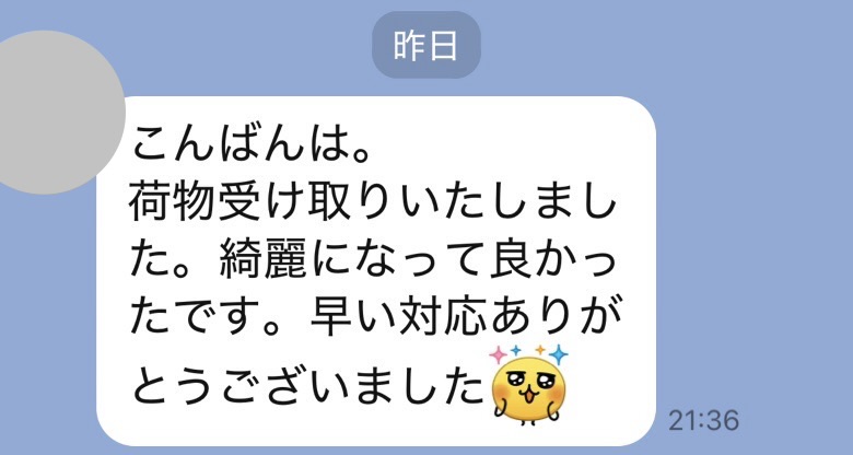 不在にしており、受け取りが遅くなりましてすみませんでした。昨日受け取りまして、とても綺麗になり感激です!!