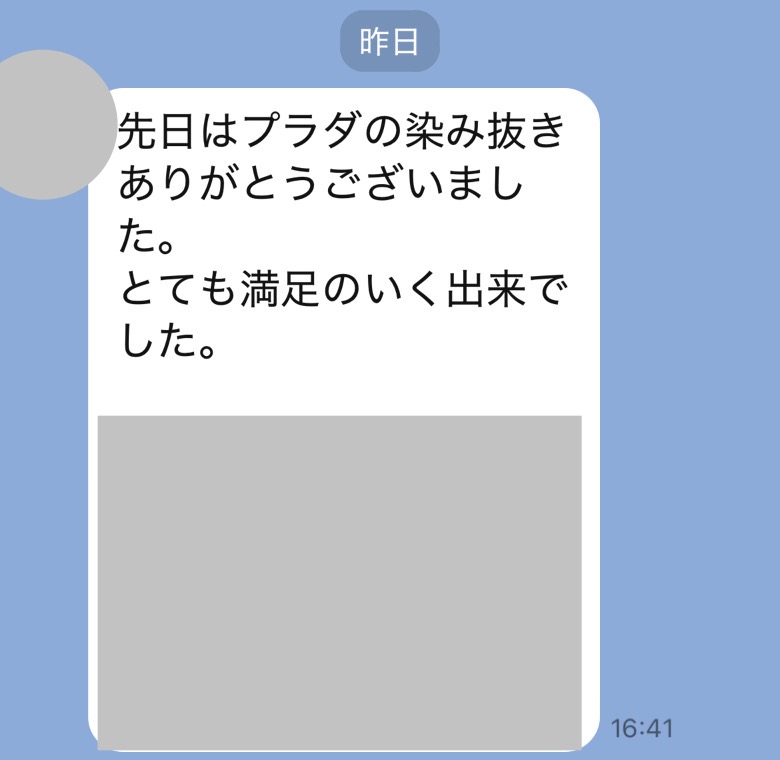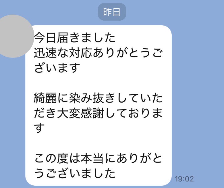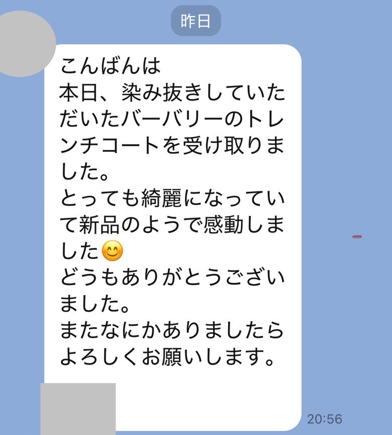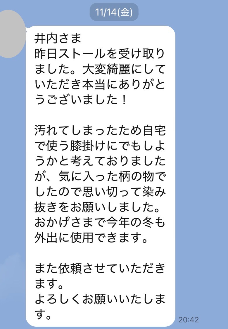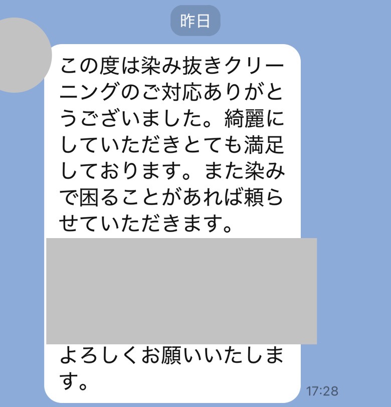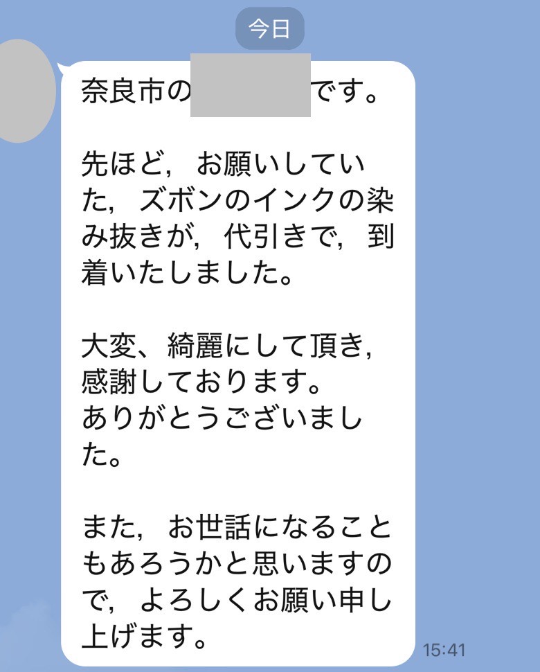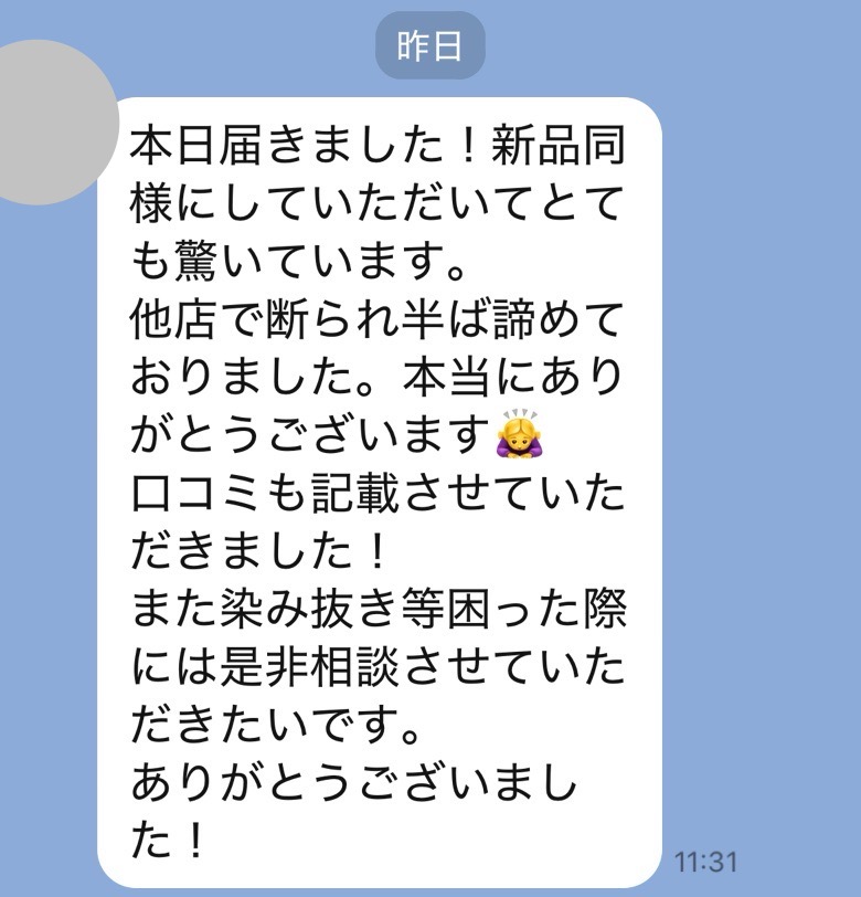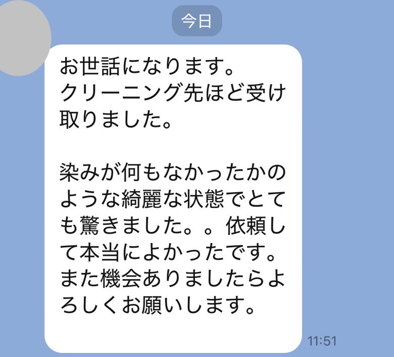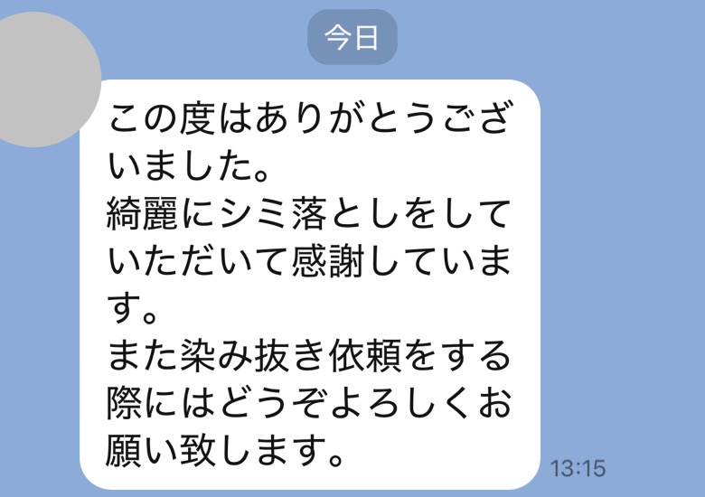 前回同様、染み抜きをご依頼して本当良かったです。