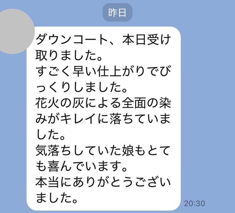 ダウンの方受け取りさせて頂きました。シミ抜きも綺麗にして頂きありがとうございました。