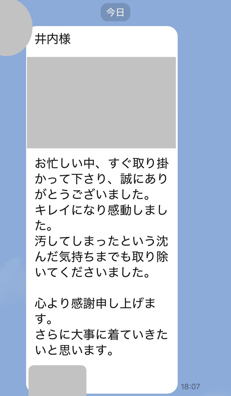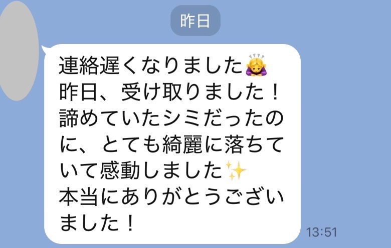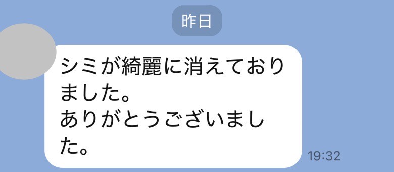 気になっていた染みが完全に消えていて、大変嬉しく思っております。