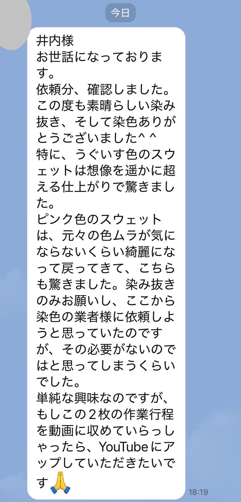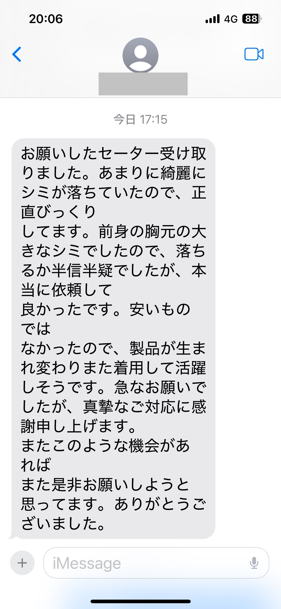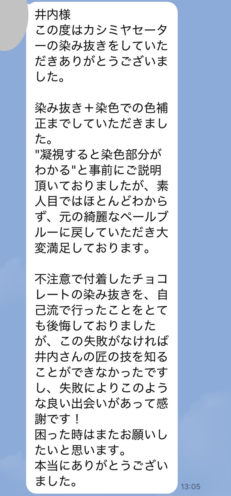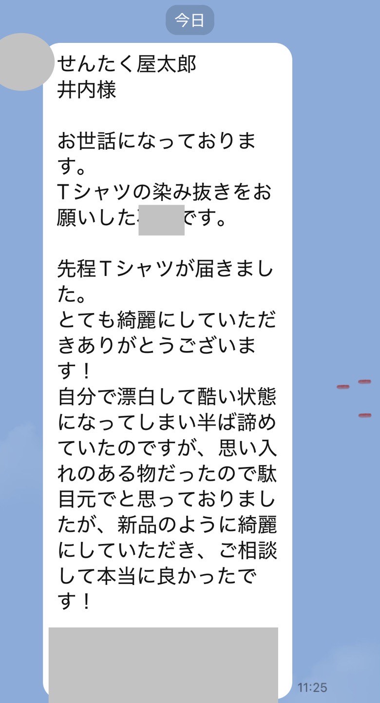 お世話になっております。この度 染み抜きをお願い致しましたIと申します。