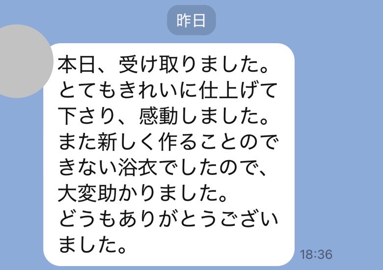 とても気に入っていた浴衣だったので嬉しかったですし家にある着物も、お願いしようと思います
