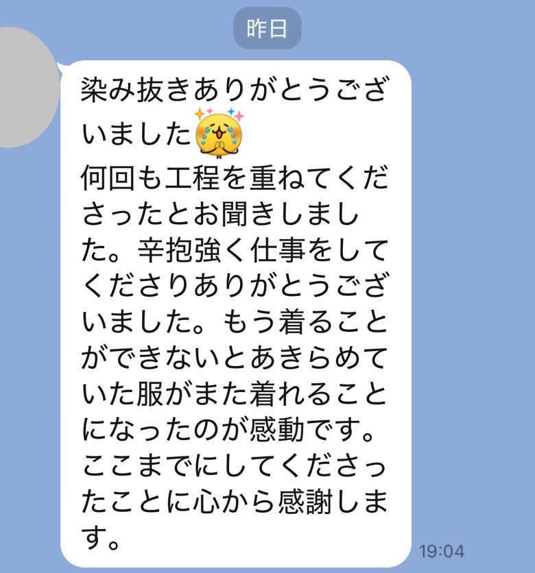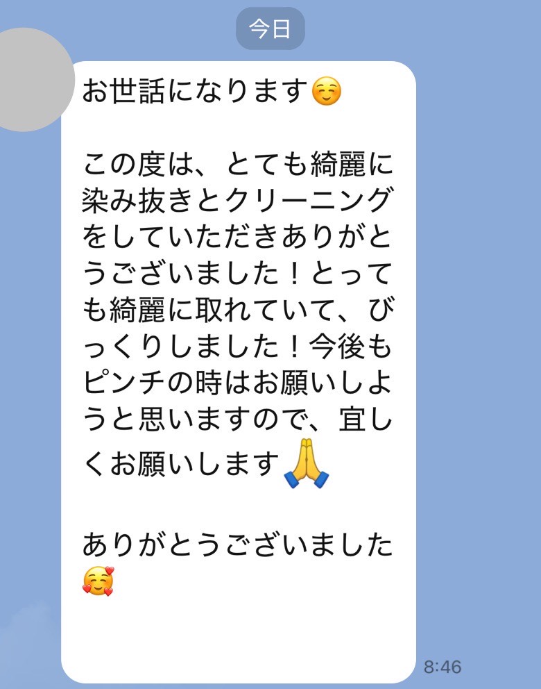他で落ちなかったシミを完全に落として、きれいに全体も仕上げていただきまして、本当にありがとうございました。