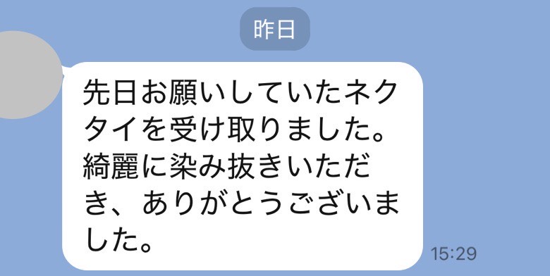 本日、ネクタイを受け取りました! 大変綺麗に仕上げていただきありがとうございます。 気に入っていた商品ですので、本当にうれしいです。 今後とも他の商品で、他で取れないシミ等ありましたら、よろしくおねがいします。 最後の砦な感じがします!笑 この度はありがとうございました。