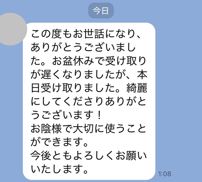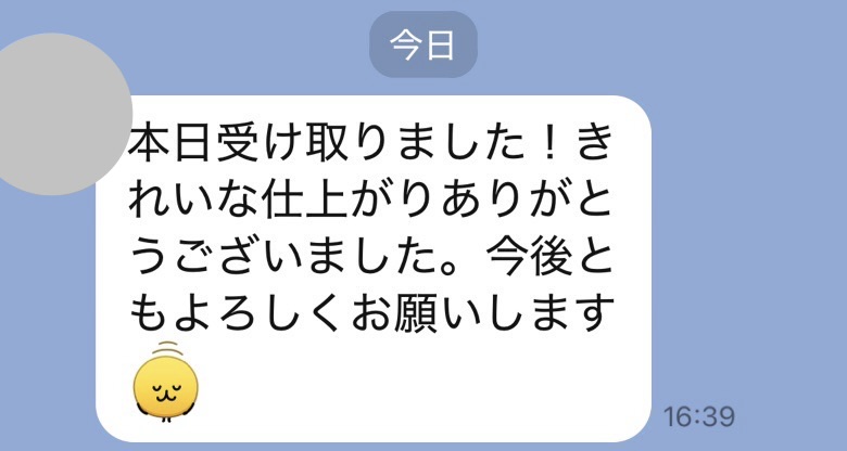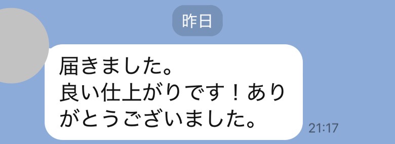 先程、お品を受け取りました予想以上の仕上がりでびっくりしました!