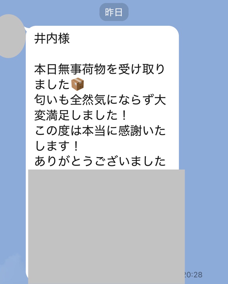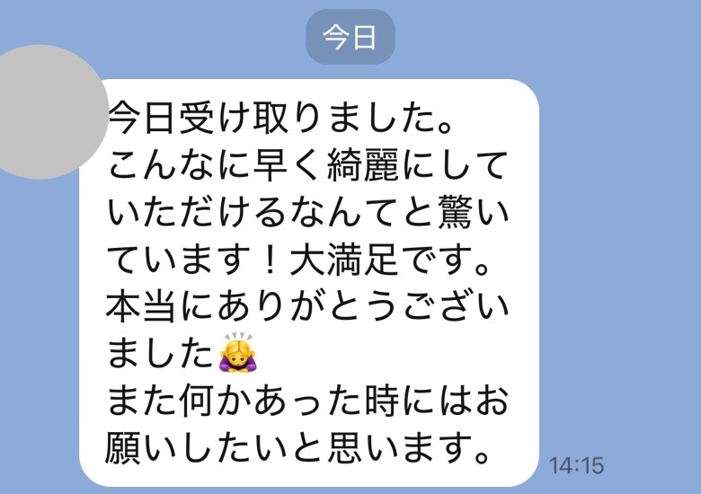 夜遅くにすいません。荷物の方確認させて頂きました。綺麗に除去できていて本当にびっくりと嬉しさで、感謝しています。