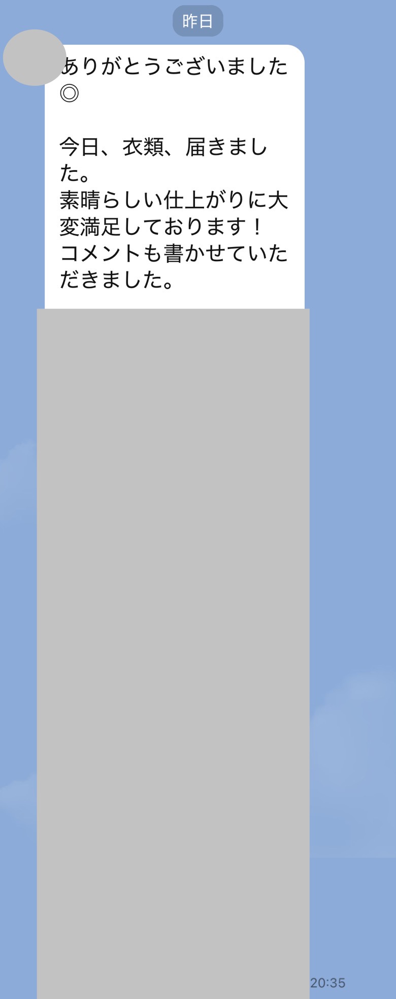 さきほど宅急便にて、服を受けとりました。
